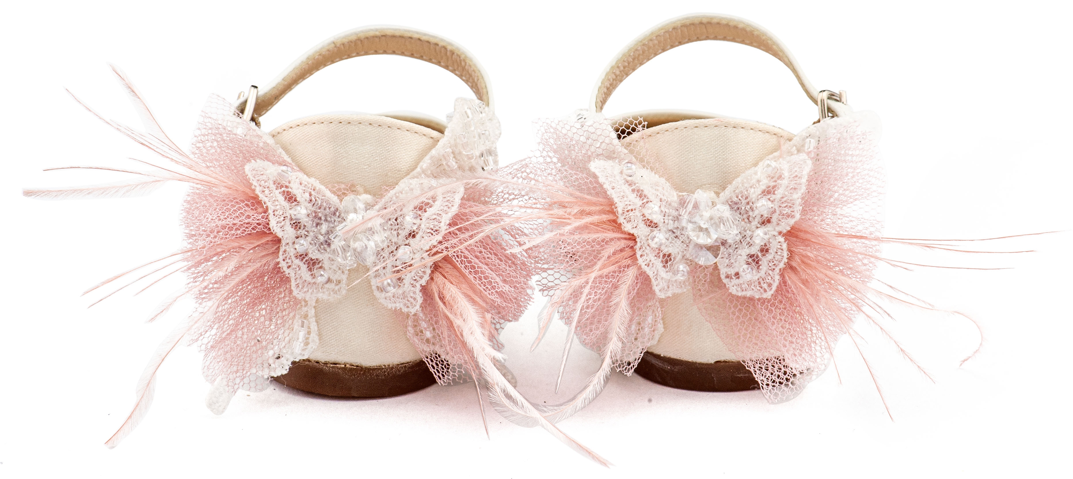 Γαλλικό Γοβάκι με Διακοσμημένη Φτέρνα με Υφασμάτινη Πεταλούδα σε Εκρού Ροζ Χρώμα και πούπουλο.