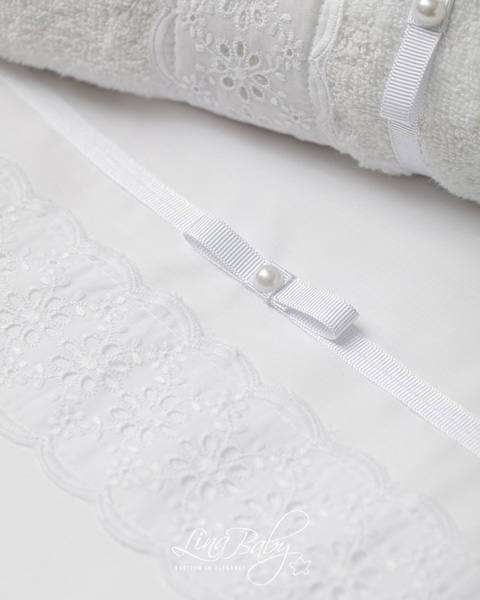 Υπέρκομψο βαμβακερό σετ λαδόπανων σε λευκό χρώμα, με Broderie Anglais Εntredeux τρέσα και βαμβακερή κορδέλα με φιογκάκι και πέρλα.
