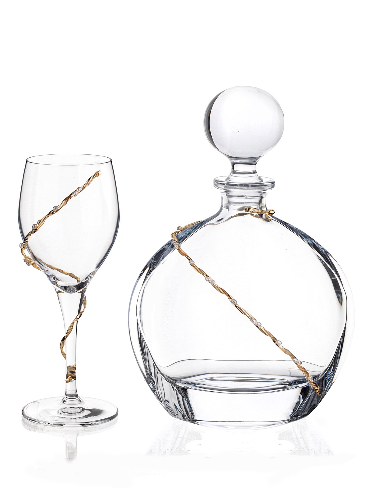 Ένα εντυπωσιακό σετ γάμου Καράφα & ποτήρι απο κρύσταλλο Βοημίας με ασημί ή χρυσό στόλισμα και πέρλες.