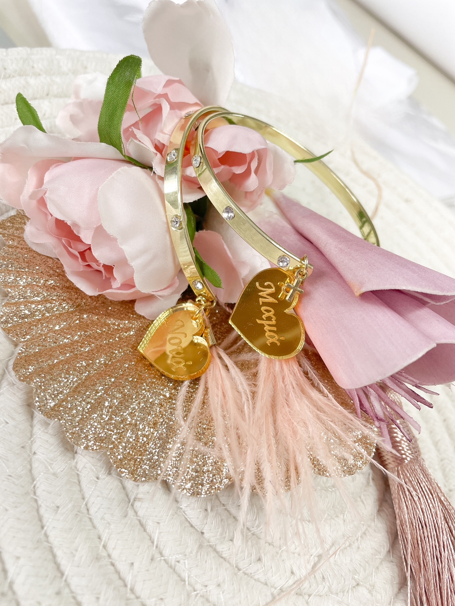 Σετ μαρτυρικά βραχιόλια για μαμά και νονά με χειροπέδα χρυσή με στρας και διακοσμητικό πούπουλο.