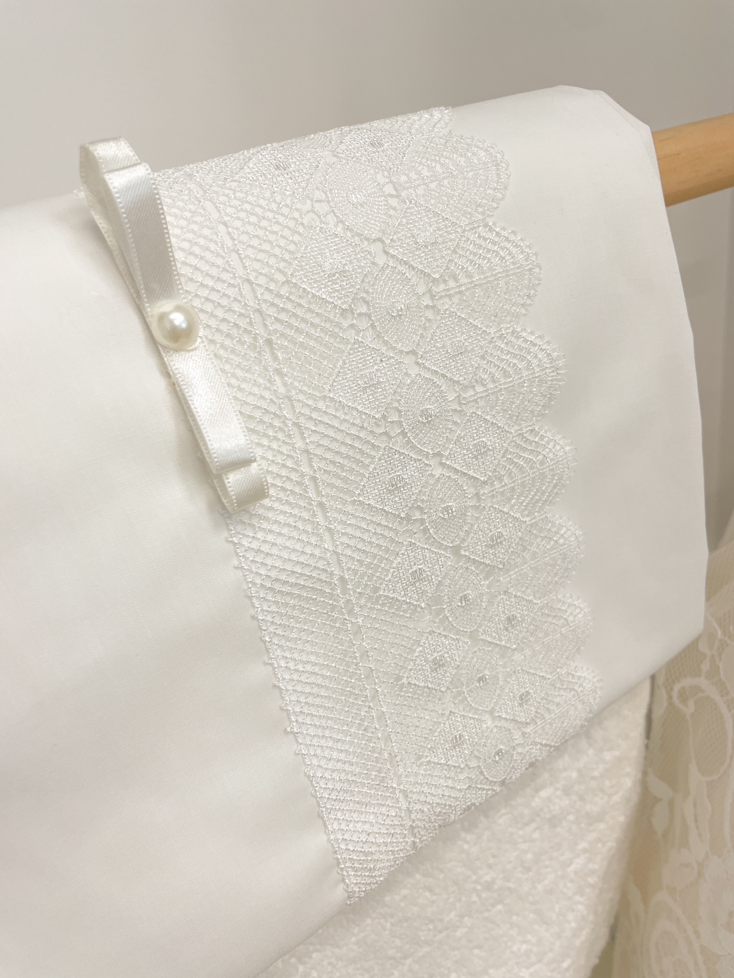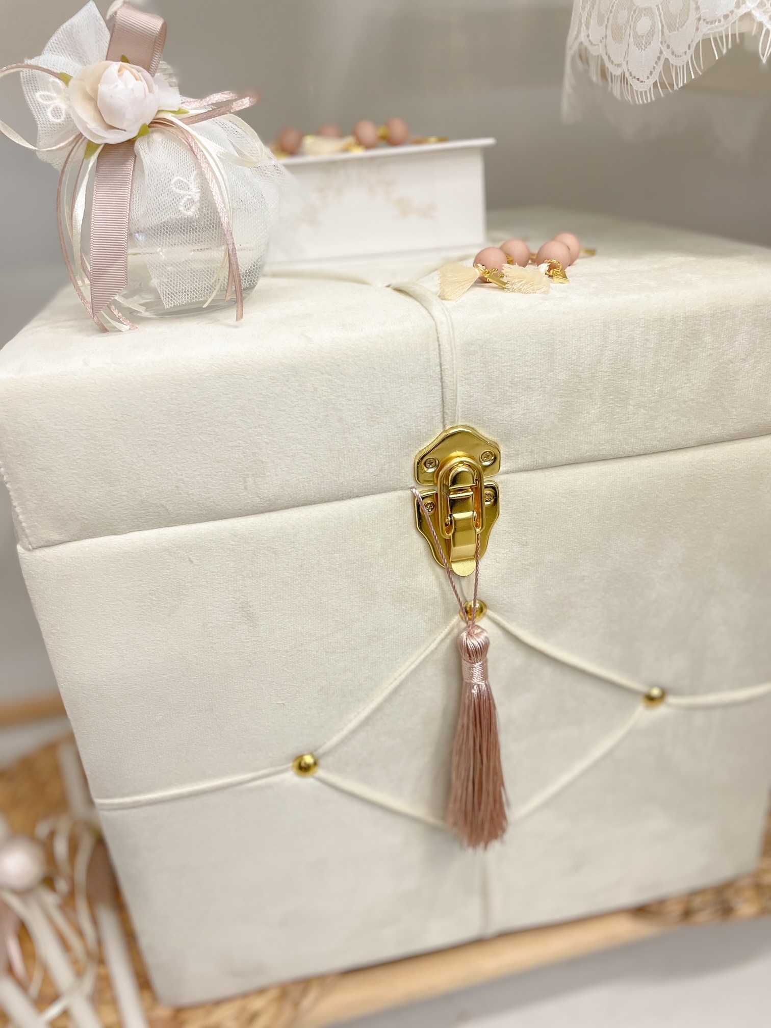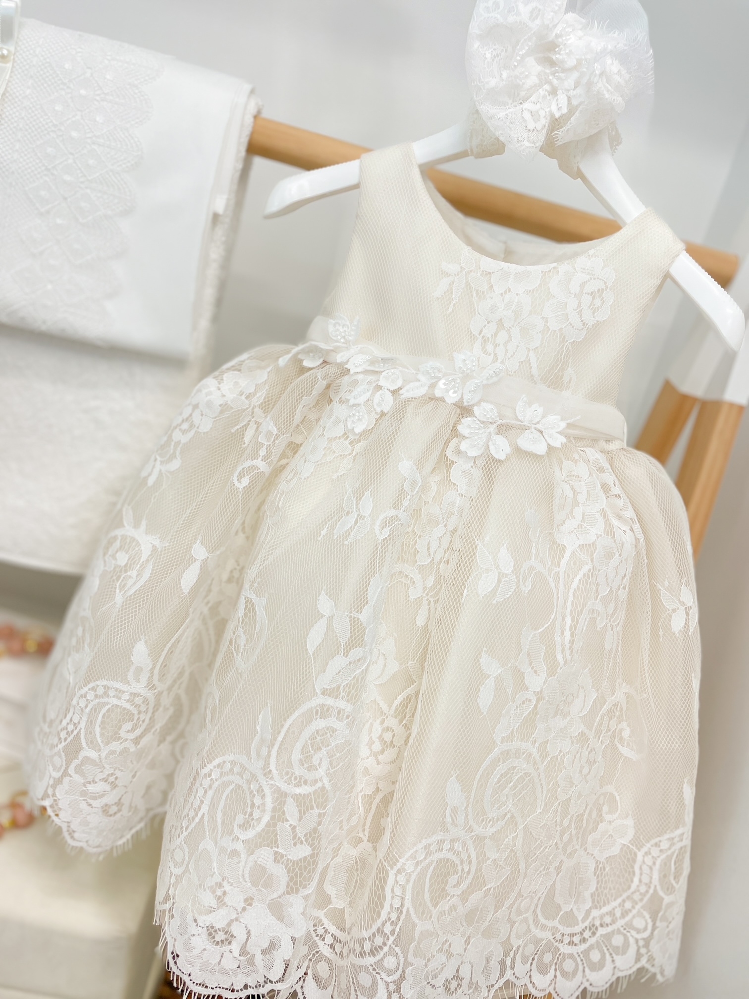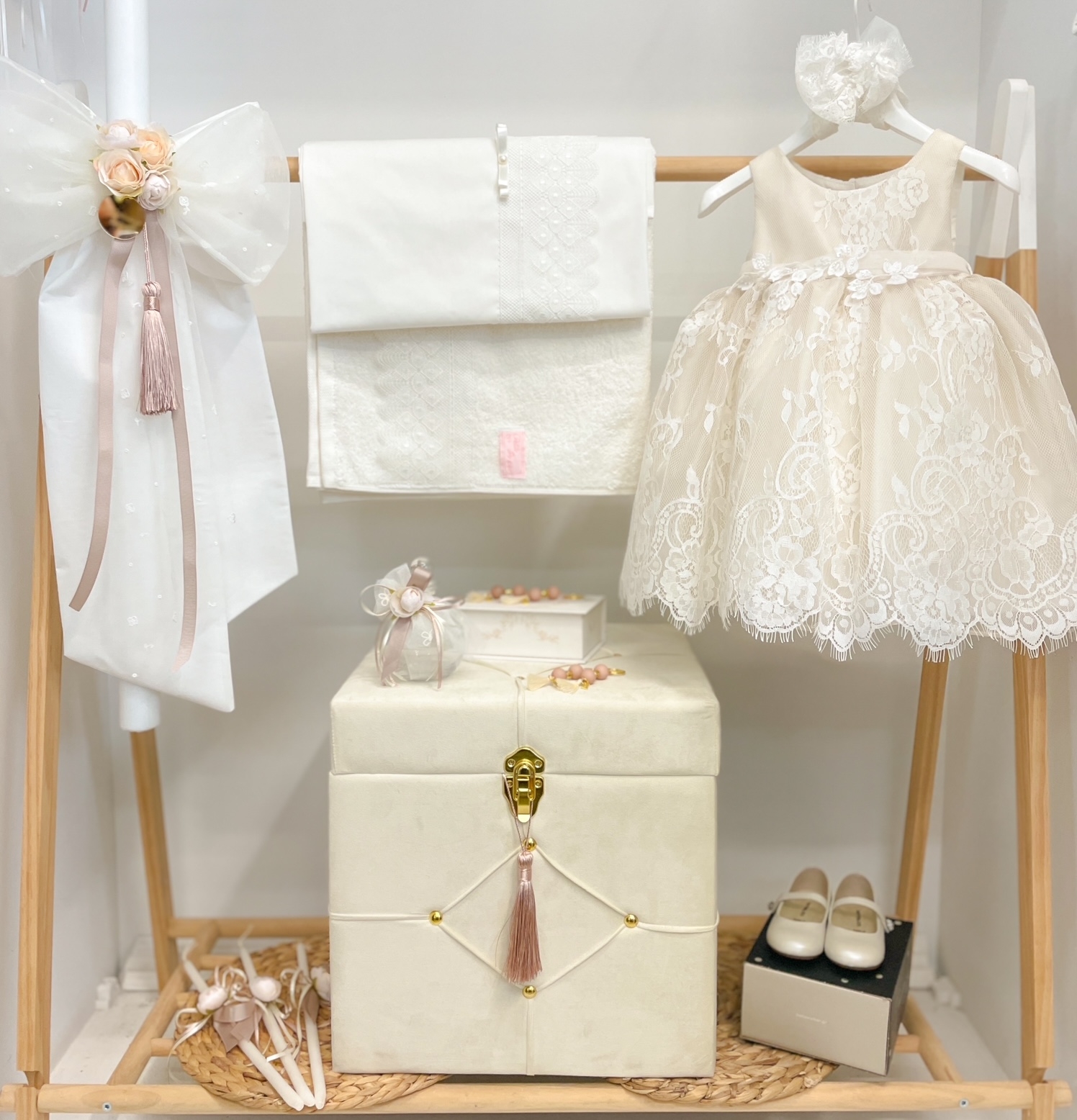 Elegant βαπτιστικό σετ για κορίτσι που συνδυάζει το σύγχρονο με το vintage. Το σετ αποτελείται από το φόρεμα με δαντέλα Γαλλίας, την κορδέλα του. βαπτιστικά παπουτσάκια με κάλτσες, σετ λαδόπανα με εσώρουχα, το βελούδινο κουτί με χρυσές λεπτομέρειες, την λαμπάδα και το σετ λαδιού με ασορτί στόλισμα.