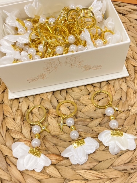 Μαρτυρικά βάπτισης για κορίτσι με λουλούδι λευκό off white σε μπρελόκ με χρυσό σταυρό.