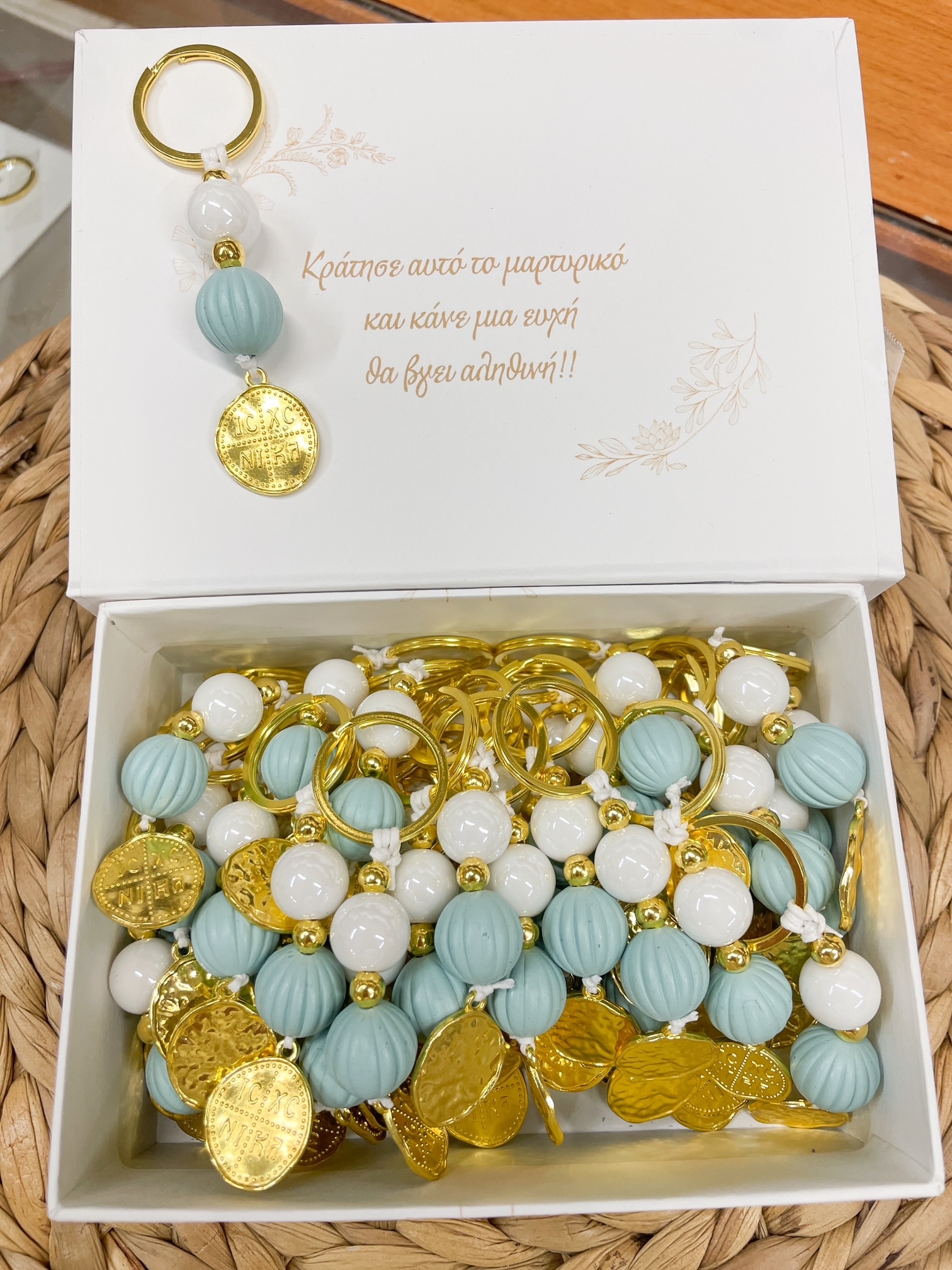 Βαπτιστικά μαρτυρικά για αγόρι σε μπρελόκ με χάντρες λευκή και σιέλ ριγέ και το Κωνσταντινάτο.
