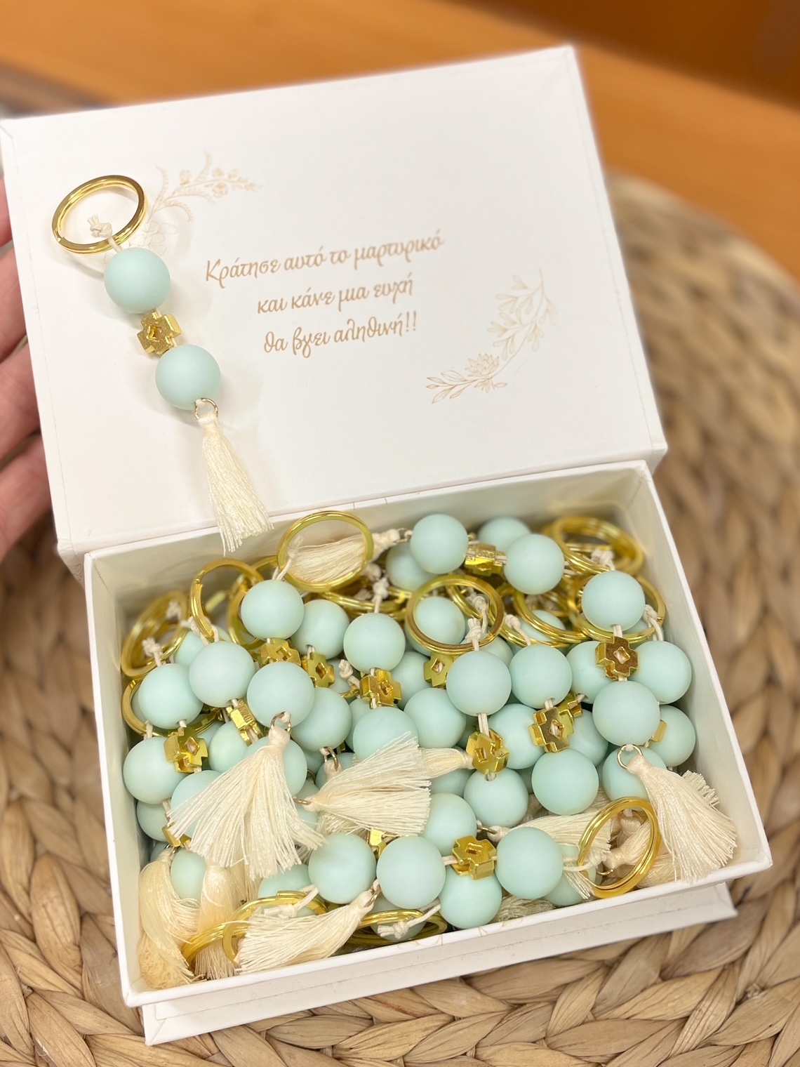 Μαρτυρικά βάπτισης σε μπρελόκ, με μέντα ματ χάντρες, χρυσό σταυρό και φουντάκι σε ιβουάρ απόχρωση!