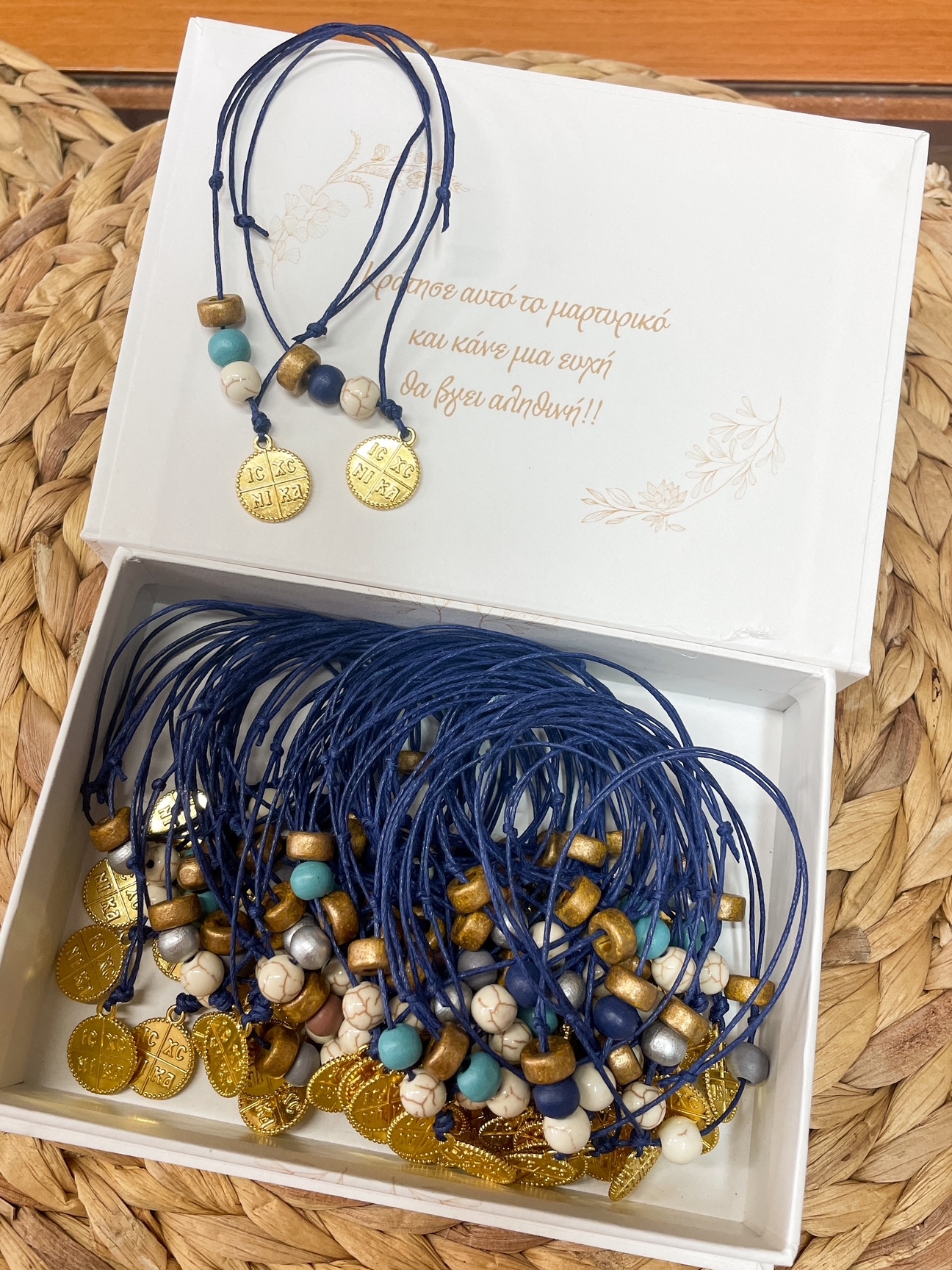 Μαρτυρικά βάπτισης για αγόρι σε βραχιολάκι με μπλε κερομένο κορδονάκι και χάντρες σε μπλε σιέλ και καφέ αποχρώσεις και χρυσό Κωνσταντινάτο