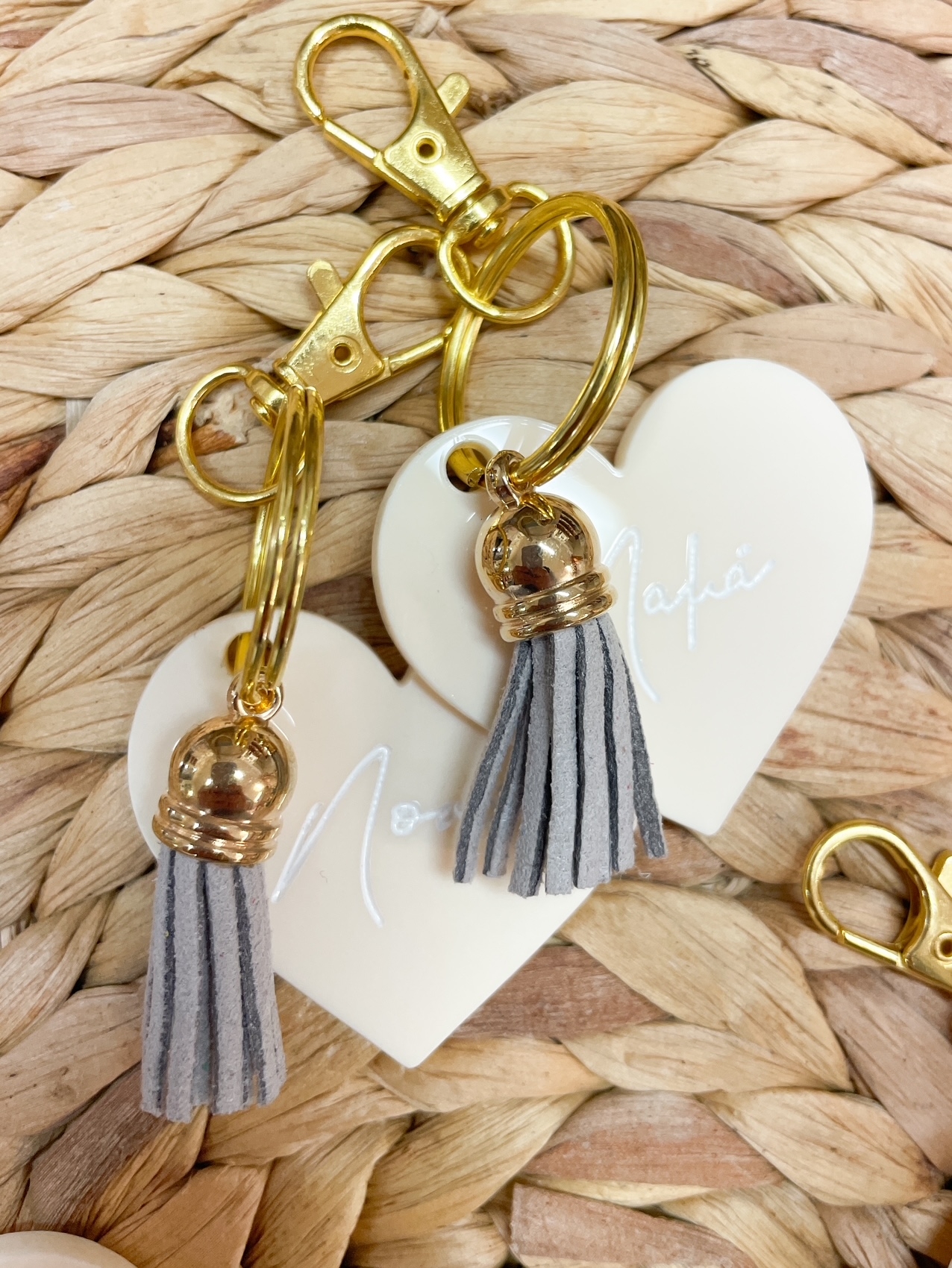 Μαρτυρικά μπρελόκ για μαμά και νονά σε μπεζ ακρυλικό με λευκή χάραξη και μπεζ δερμάτινη φούντα. Η τιμή αφορά το σετ!