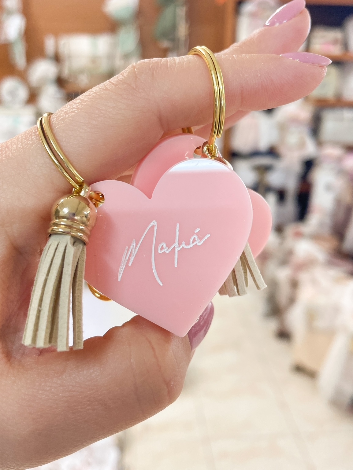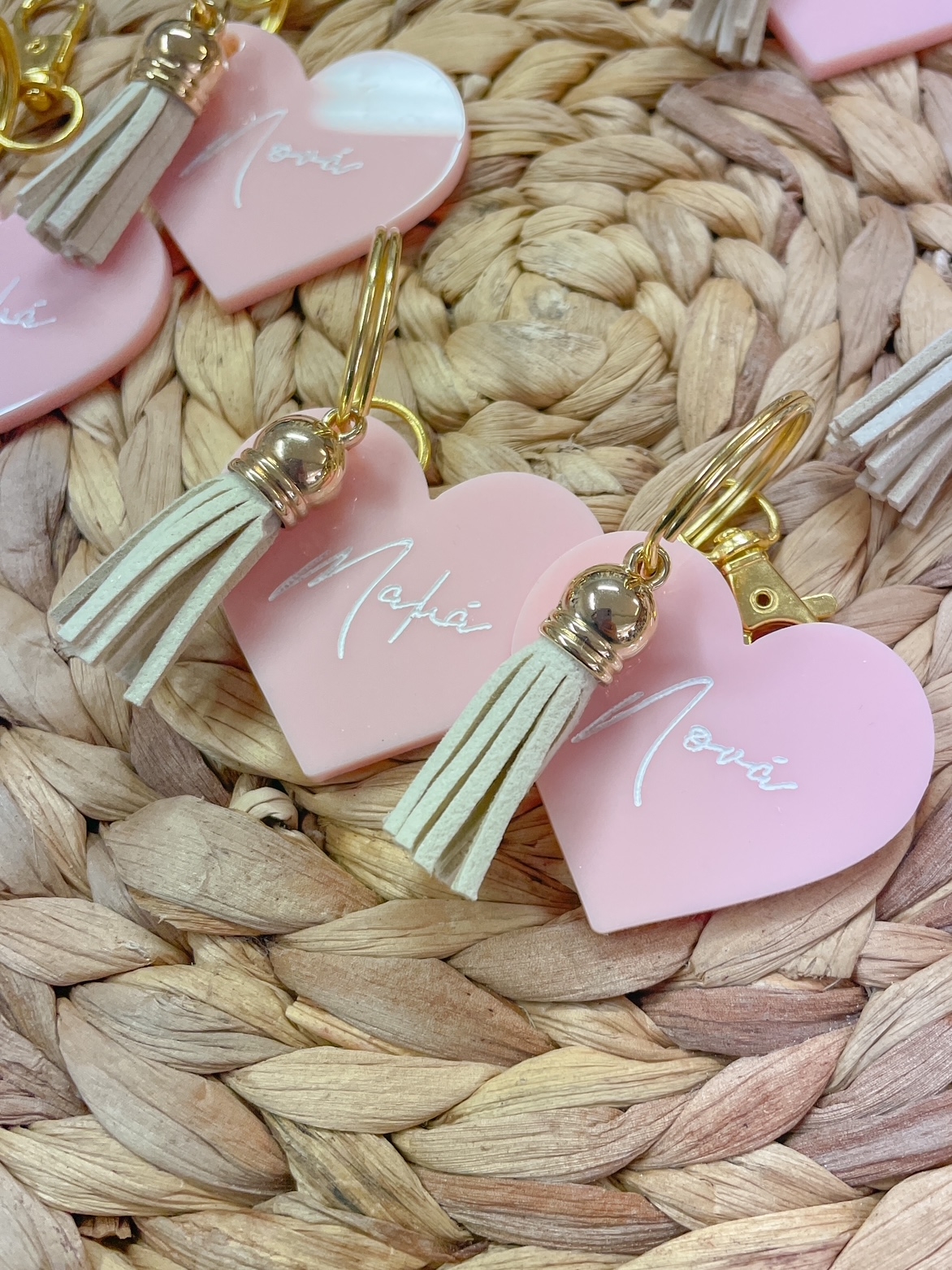 Μαρτυρικά μπρελόκ για μαμά και νονά σε roz ακρυλικό με λευκή χάραξη και ιβουάρ δερμάτινη φούντα. Η τιμή αφορά το σετ!