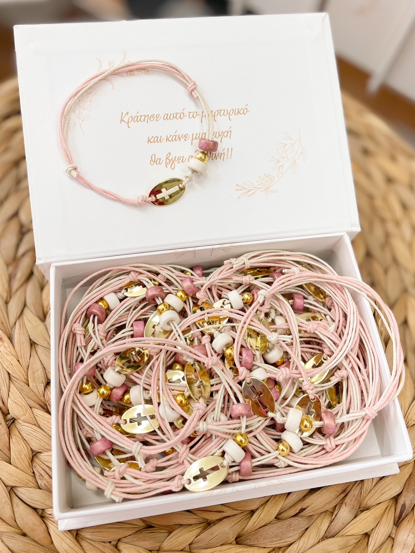 Βαπτιστικά μαρτυρικά σε βραχιολάκι, ροζ σάπιο μήλο απόχρωση με ιβουάρ και χρωματιστές χάντρες.