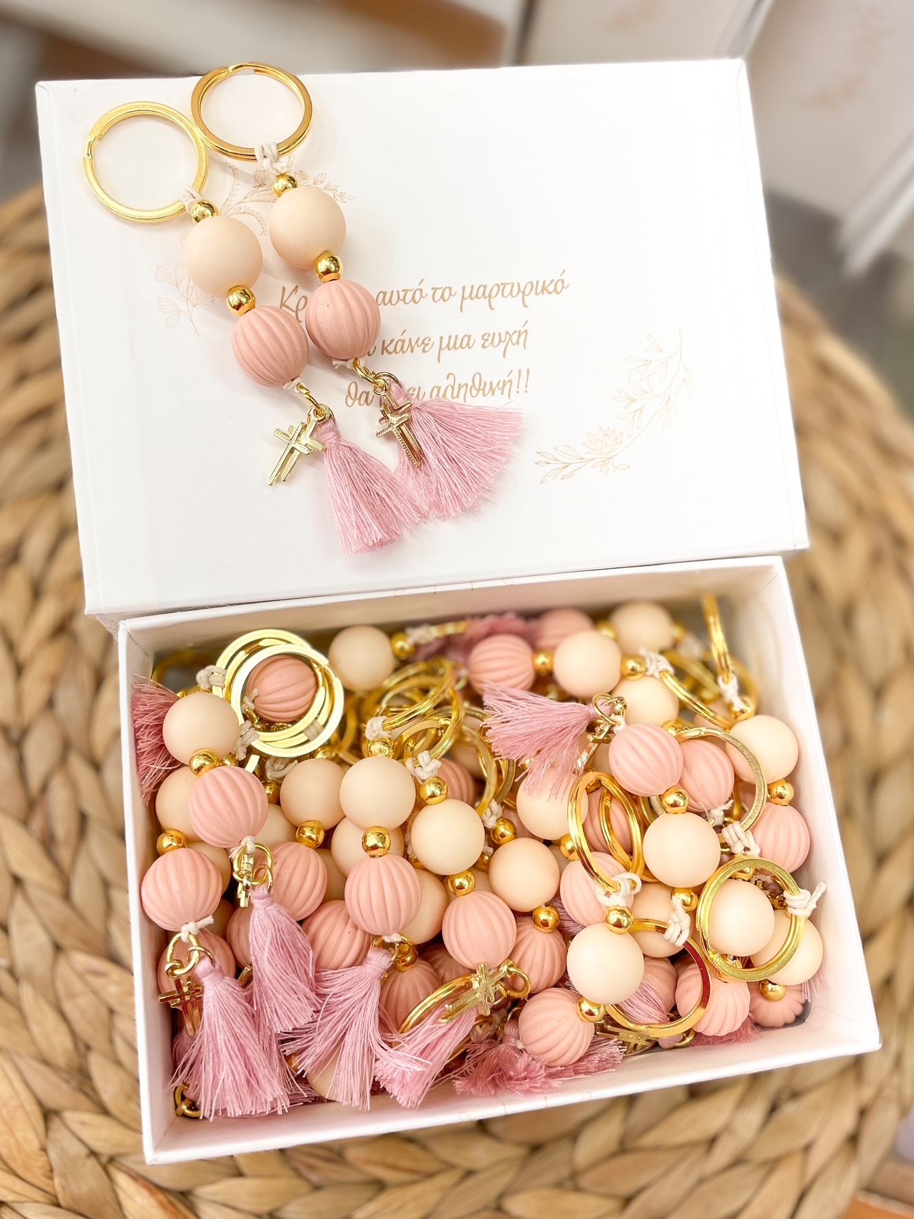 Μαρτυρικά βάπτισης μπρελόκ με χάντρες σε σάπιο μήλο ιβουάρ αποχρώσεις, με φουντάκι και σταυρό.