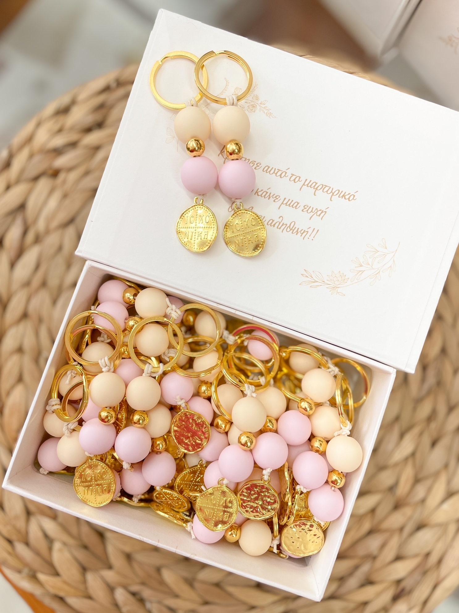 Μαρτυρικά βάπτισης για κορίτσι μπρελόκ με Κωνσταντινάτο σε ιβουάρ ροζ χρώμα.