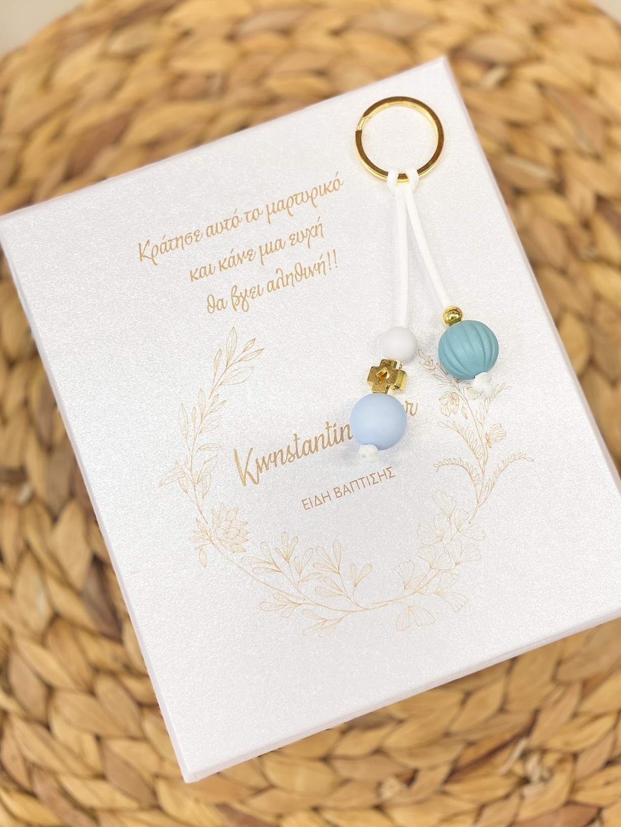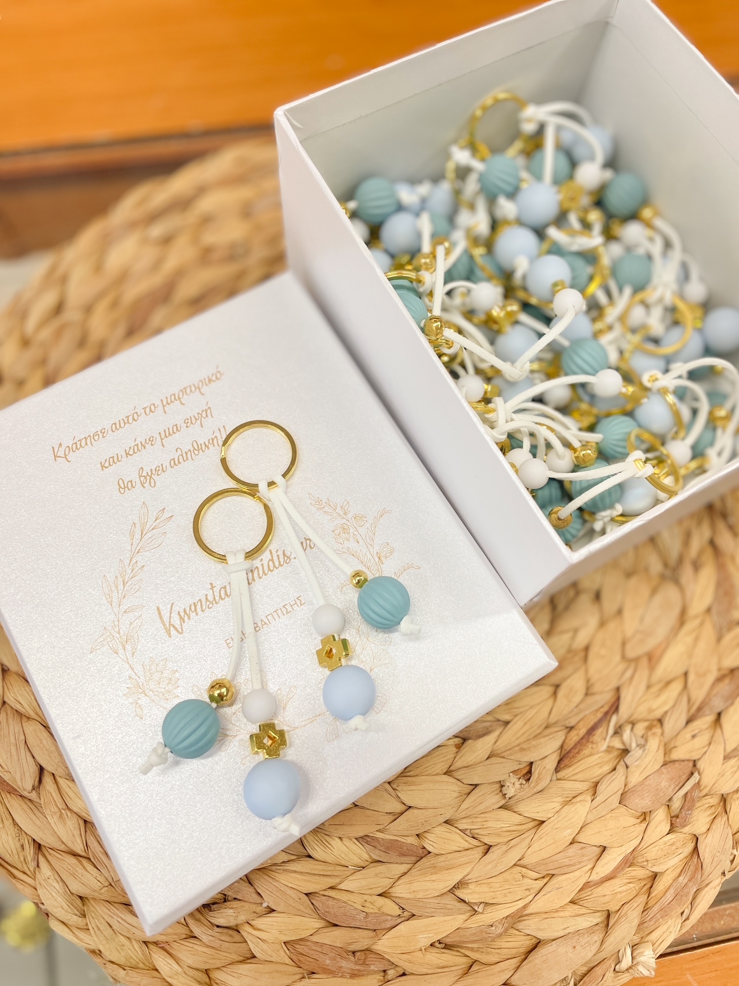 Μαρτυρικό βάπτισης από λευκό suede κορδονάκι, με σιέλ και ραφ χάντρες, μικρές χρυσές και χρυσό σταυρό. Αν αφαιρεθεί από το μπρελόκ μπορεί να γίνει και μπεγλέρι.