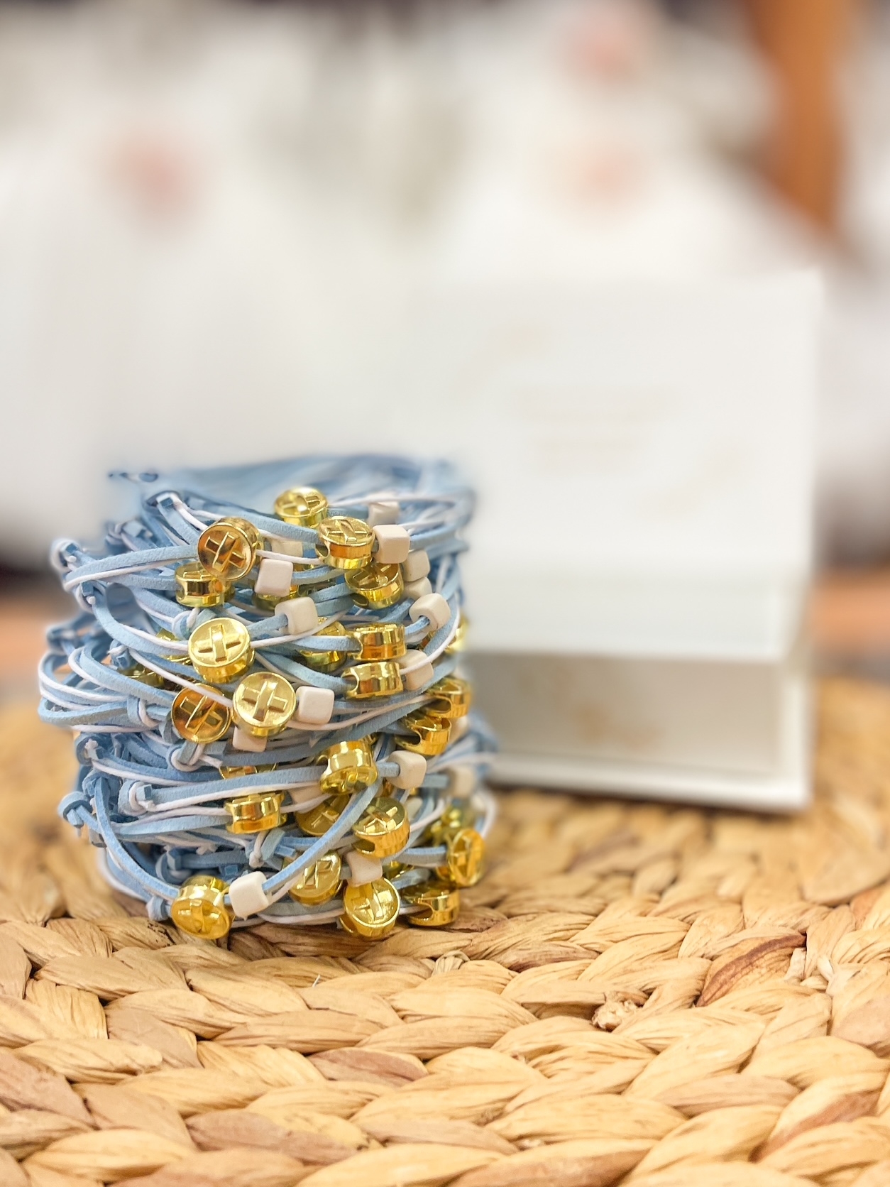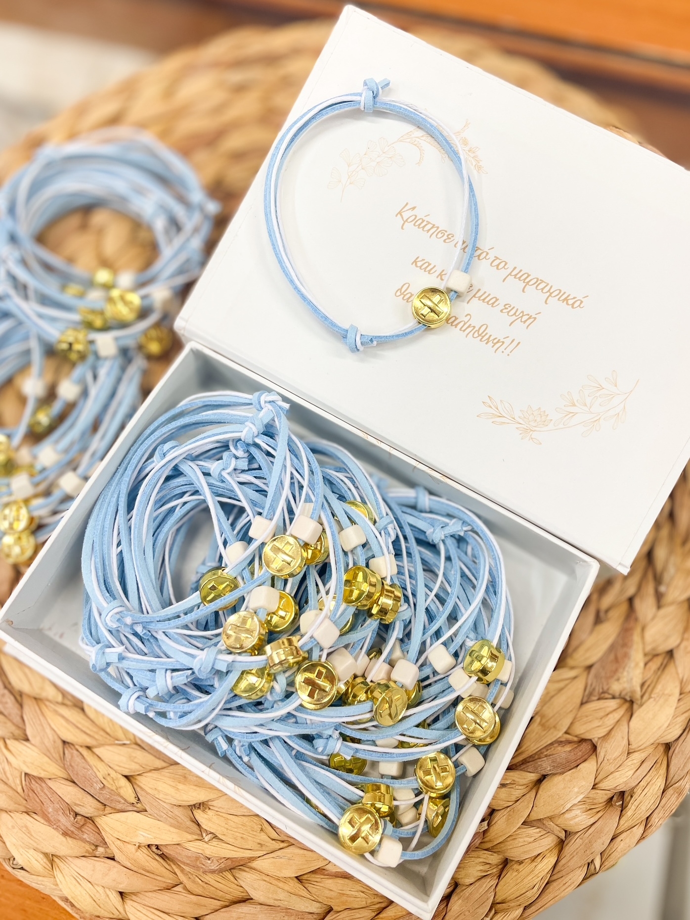 Μαρτυρικά βάπτισης, βραχιολάκι, σιέλ suede δερματάκι με λευκό λεπτό κορδονάκι, χρυσό σταυρό και λευκό χαντράκι τετράγωνο.