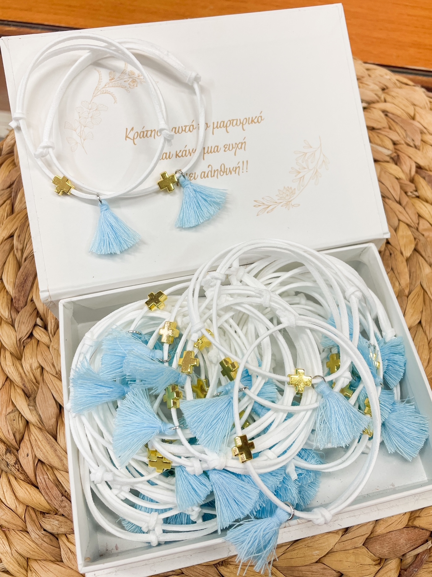 μαρτυρικά βάπτισης βραχιολάκι λευκό σιέλ χρυσός σταυρός μπρελόκ πέτου απλό οικονομικό : 1