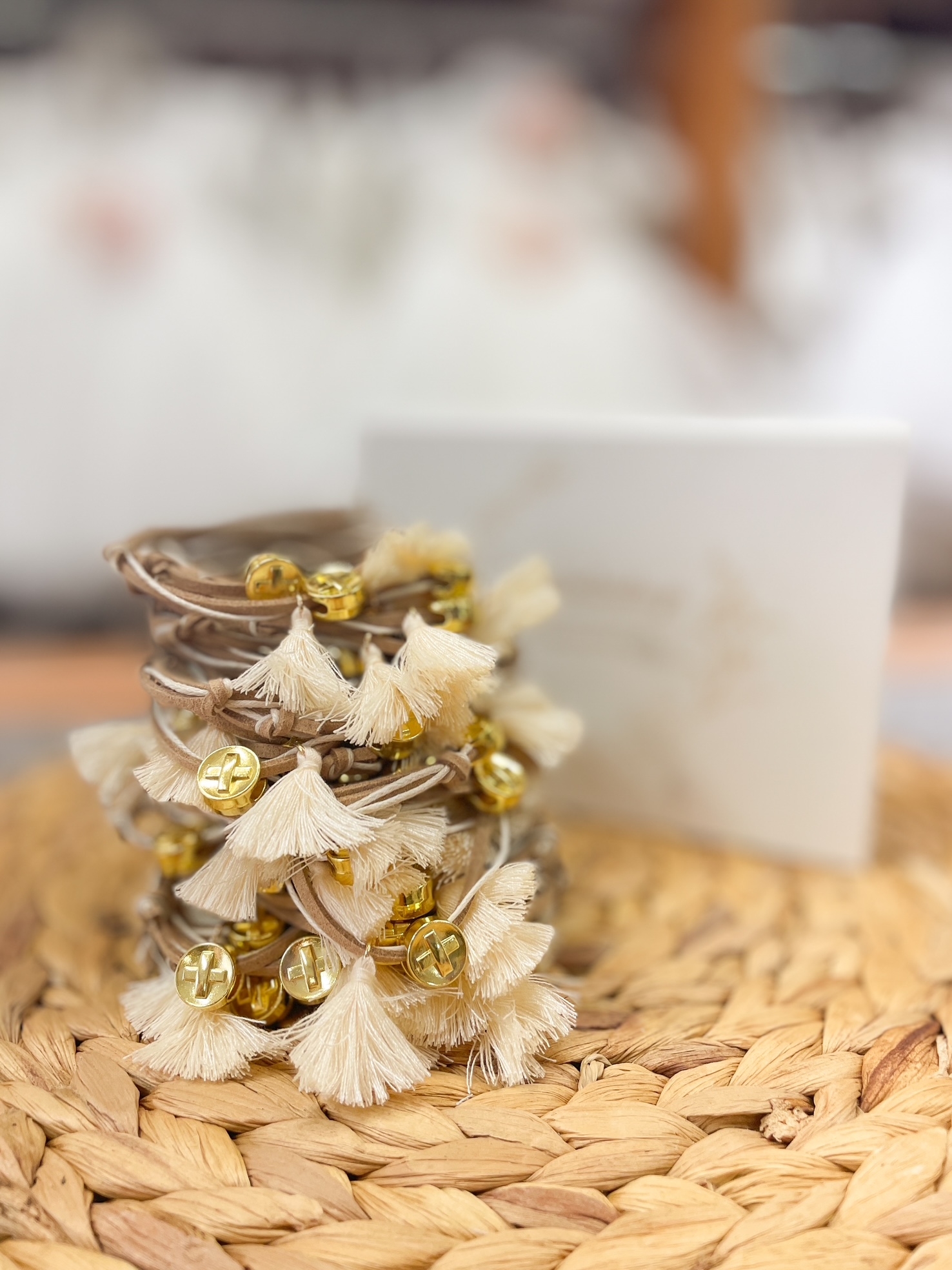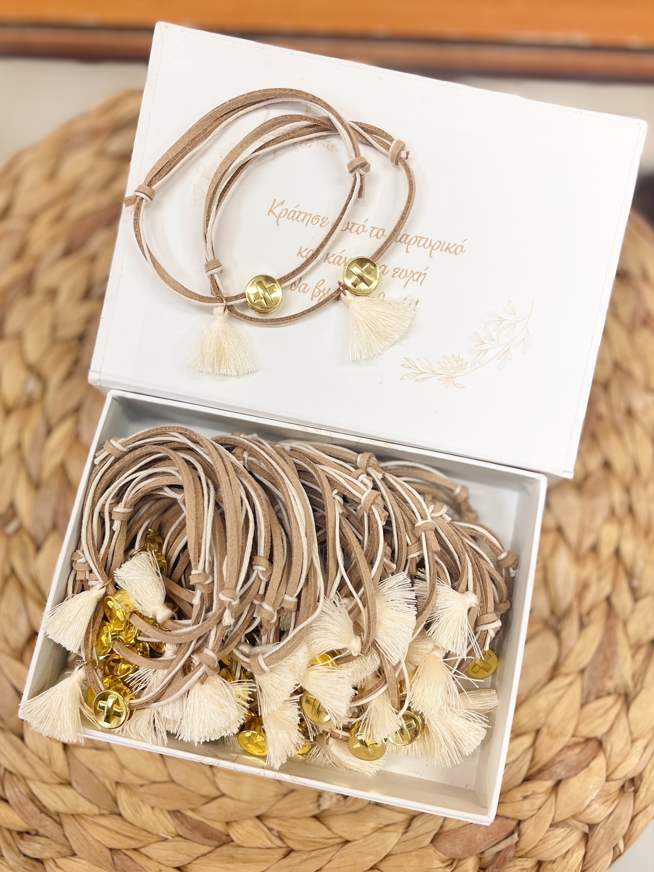 Μαρτυρικά βάπτισης, βραχιολάκι, μπεζ suede δερματάκι με λεπτό κορδονάκι, χρυσό σταυρό και ιβουάρ φουντάκι.