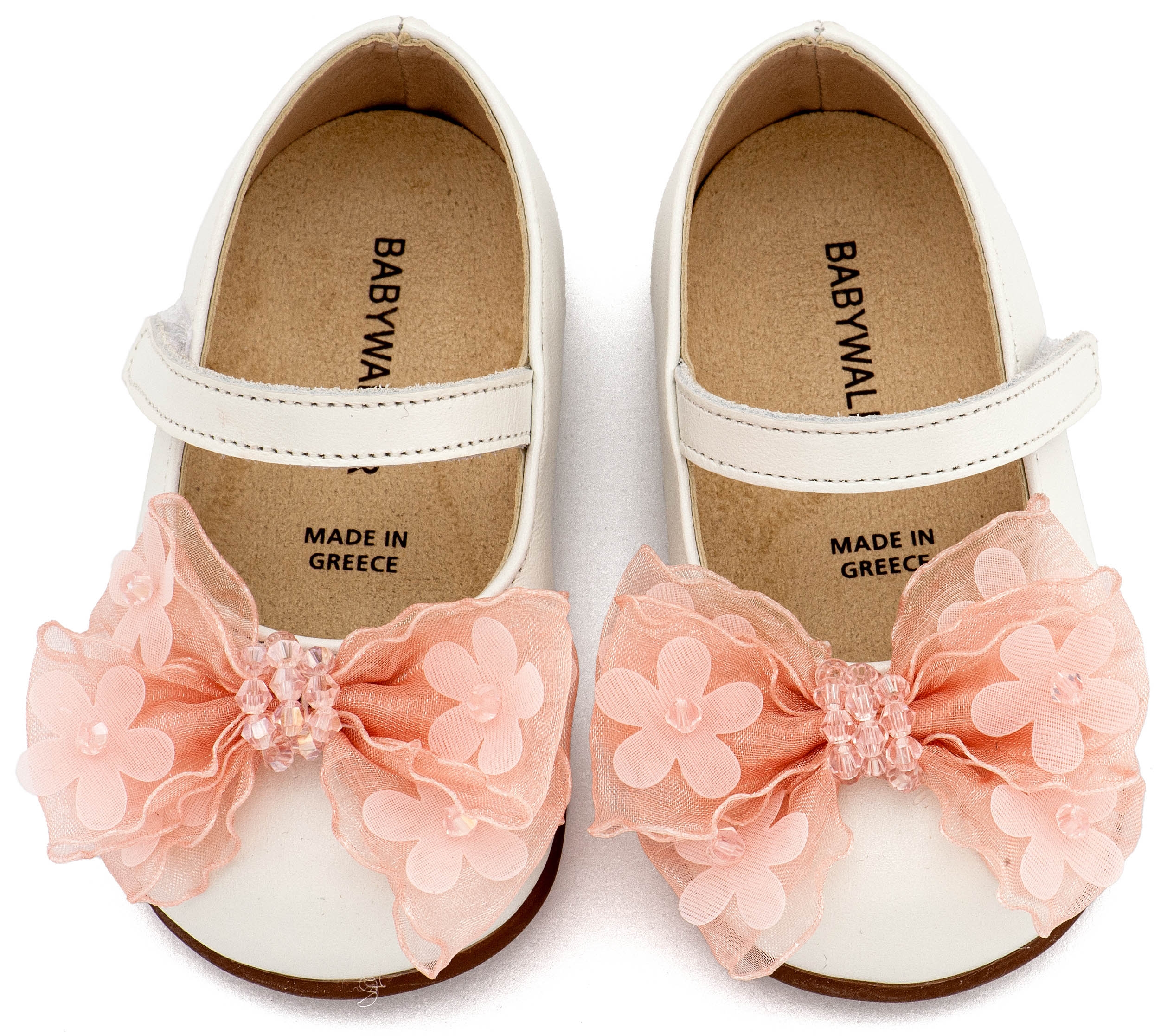 Δερμάτινο Γοβάκι Μονή Μπαρέτα Φιογκάκι Οργάντζας σε Εκρού Ροζ Χρώμα.