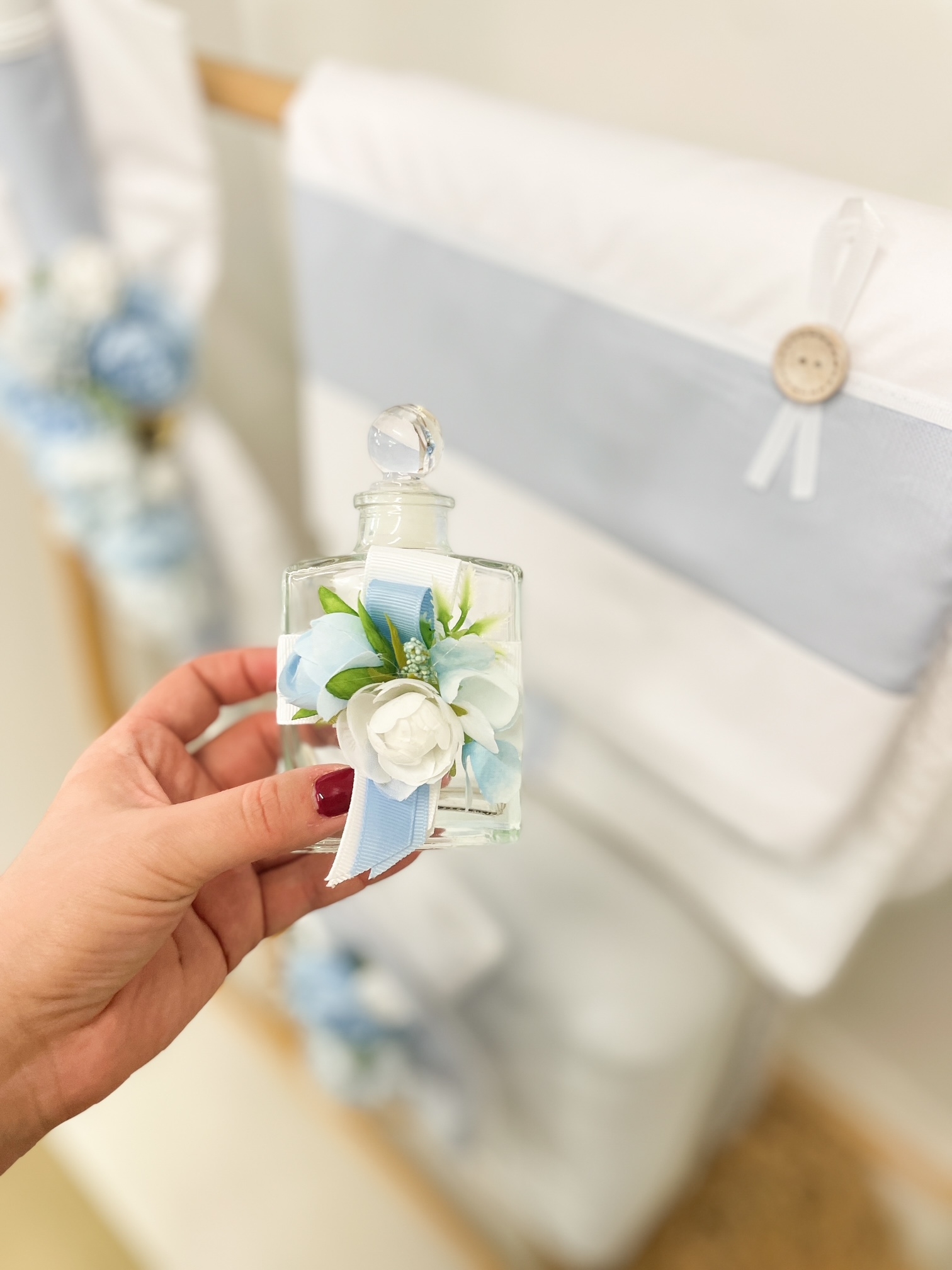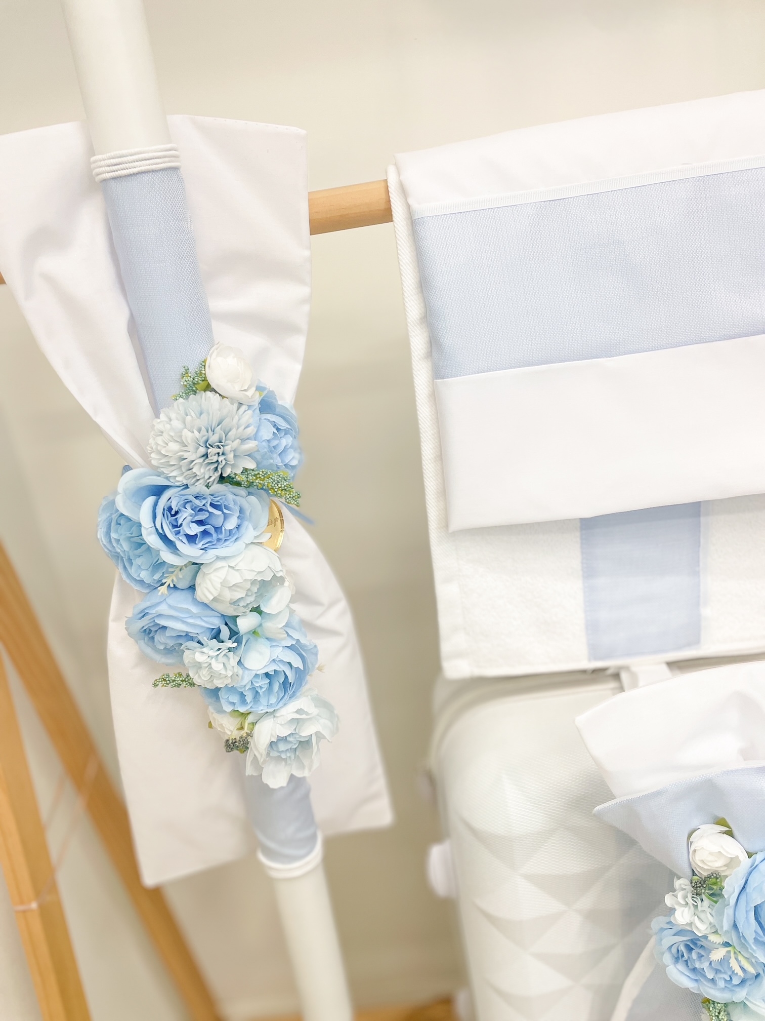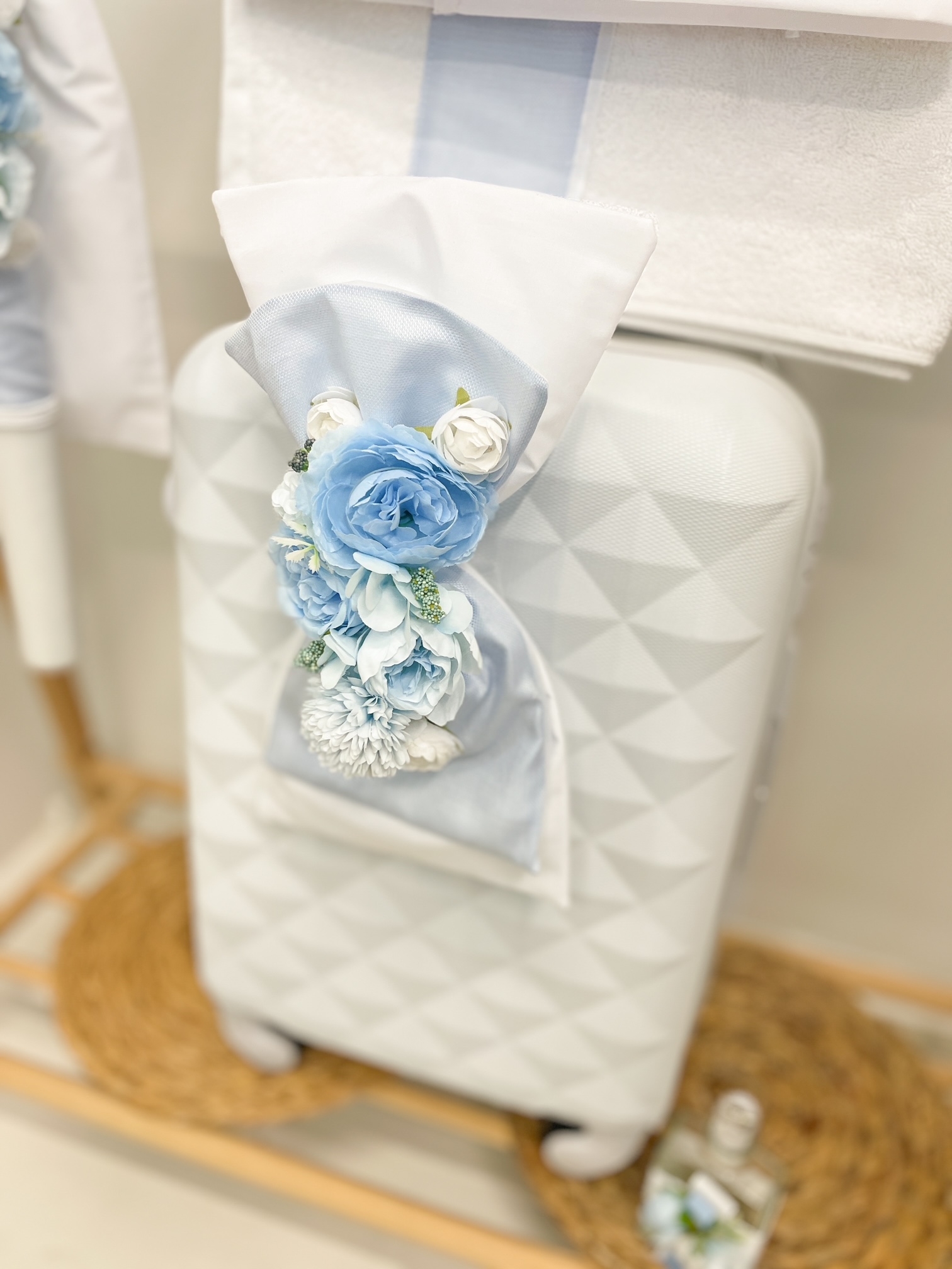 Το σετ περιλαμβάνει την βαλίτσα σε λευκό χρώμα στολισμένη, την ασορτί λαμπάδα, το σετ λαδόπανα με σεντονάκι, πετσέτα και τα εσώρουχα(3τμχ) και τέλος το σετ του λαδιού (3 κεράκια κολυμπήθρας, πετσέτα του ιερέα, σαπουνάκι και μπουκάλι για το λάδι).