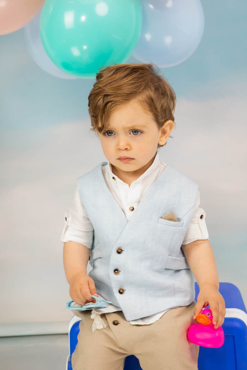 O Antreas είναι ένα σιέλ μπεζ βαπτιστικό σετ για αγόρια ελληνικής ραφής. Γιλέκο σιέλ από λινή γάζα 100% Πουκάμισο από εκρού λινάρι 100% με Μάο γιακά και φουλάρι με μπεζ αστεράκια. Παντελόνι μπεζ rammie ιδιαίτερο κόψιμο και ζώνη. Καπέλο ψάθινο σε φυσικό χρώμα με εκρού κορδόνι.