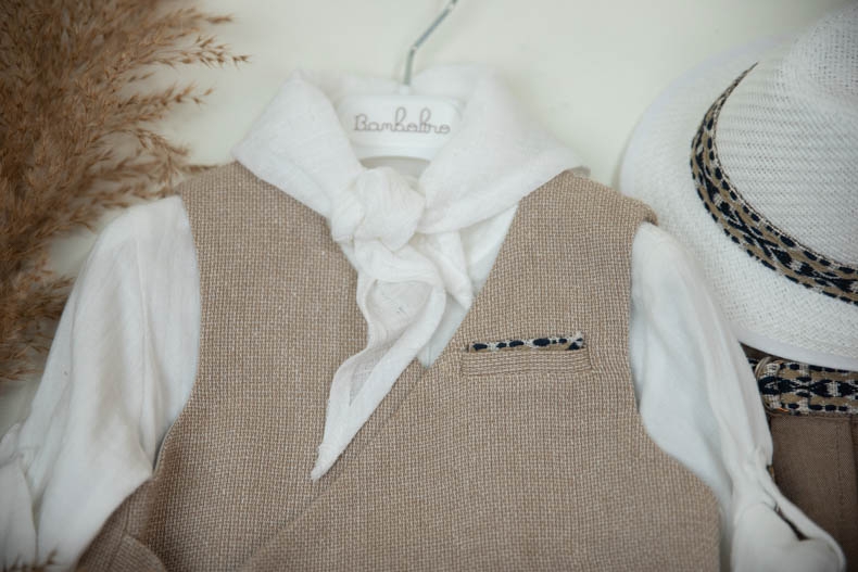 Ο Arnold είναι ένα σοκολά μονόχρωμο σύνολο βάπτισης must have για αγόρι. Αποτελείται από ιδιαίτερο γιλέκο απο exclusive ψάθα, λευκό loose fit πουκαμίσα και σοκολά παντελόνι με ιδιαίτερο κόψιμο και ζώνη που του δίνει μια boho ρότα. Αξεσουάρ το φουλάρι και το ψάθινο λευκό καβουράκι για το κεφάλι.
