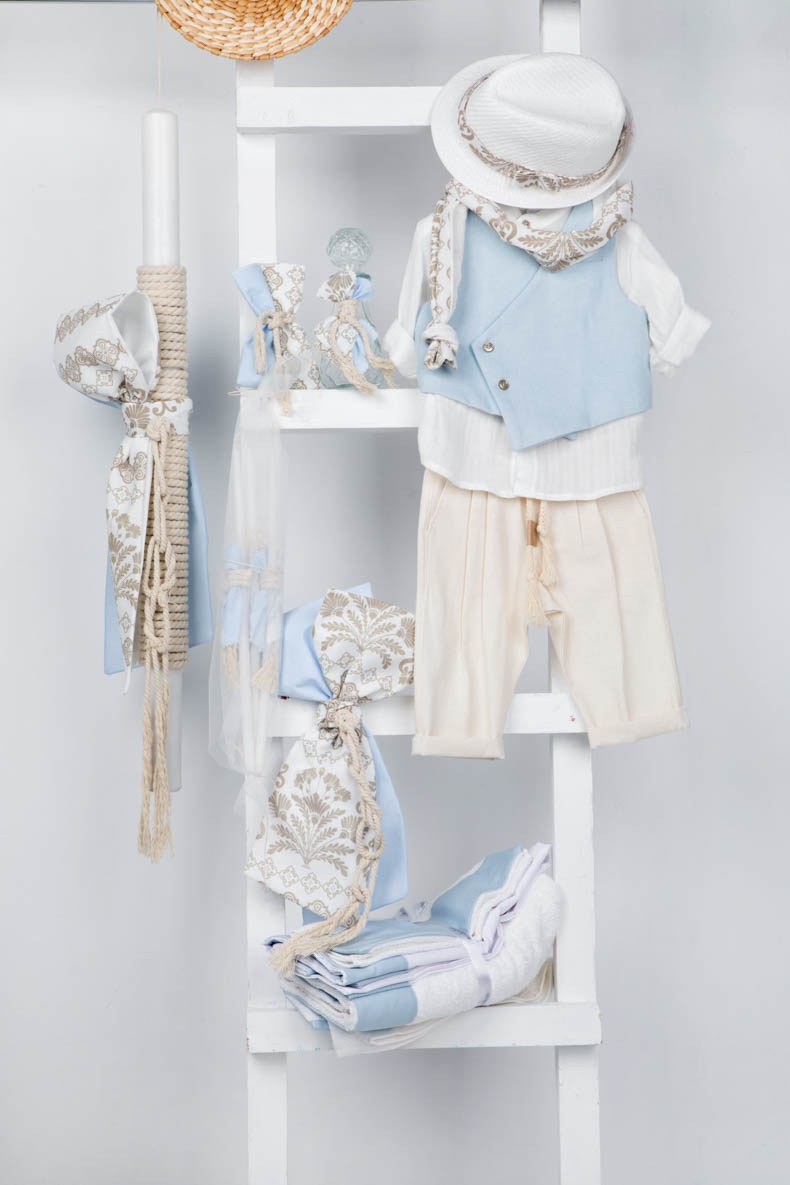 Ο Emerson είναι ένας classic but modern συνδυασμός βάπτισης. Αποτελείται από εκρού παντελόνι με πιέτες, εκρού γάζα πουκάμισο με μάο γιακά και στραβό σιέλ γιλέκο διακοσμημένο με κουμπιά. Αξεσουάρ είναι το εκρού-μπεζ κορδόνι για ζώνη, το λευκό καβούρι και το printed φουλάρι του.