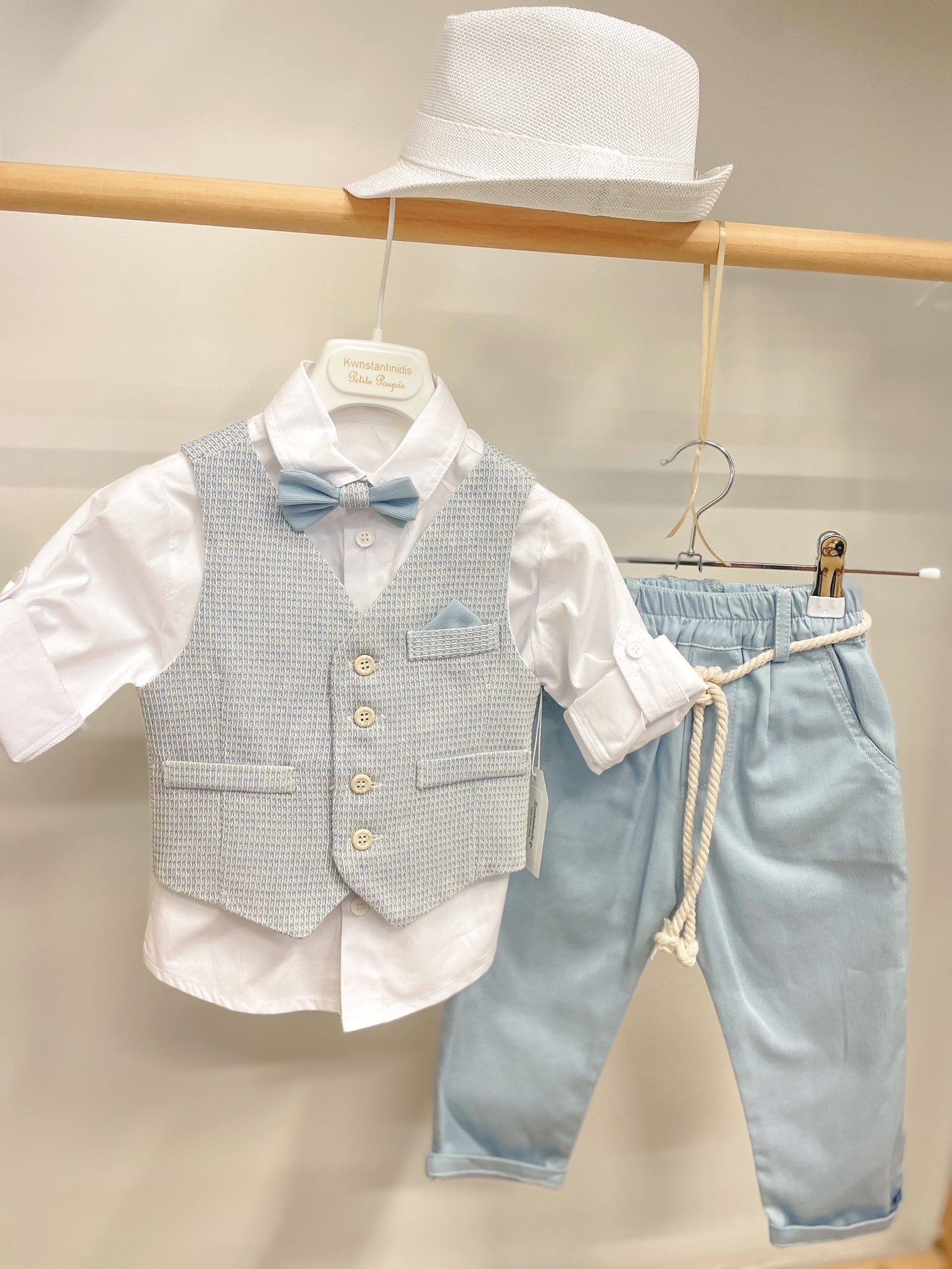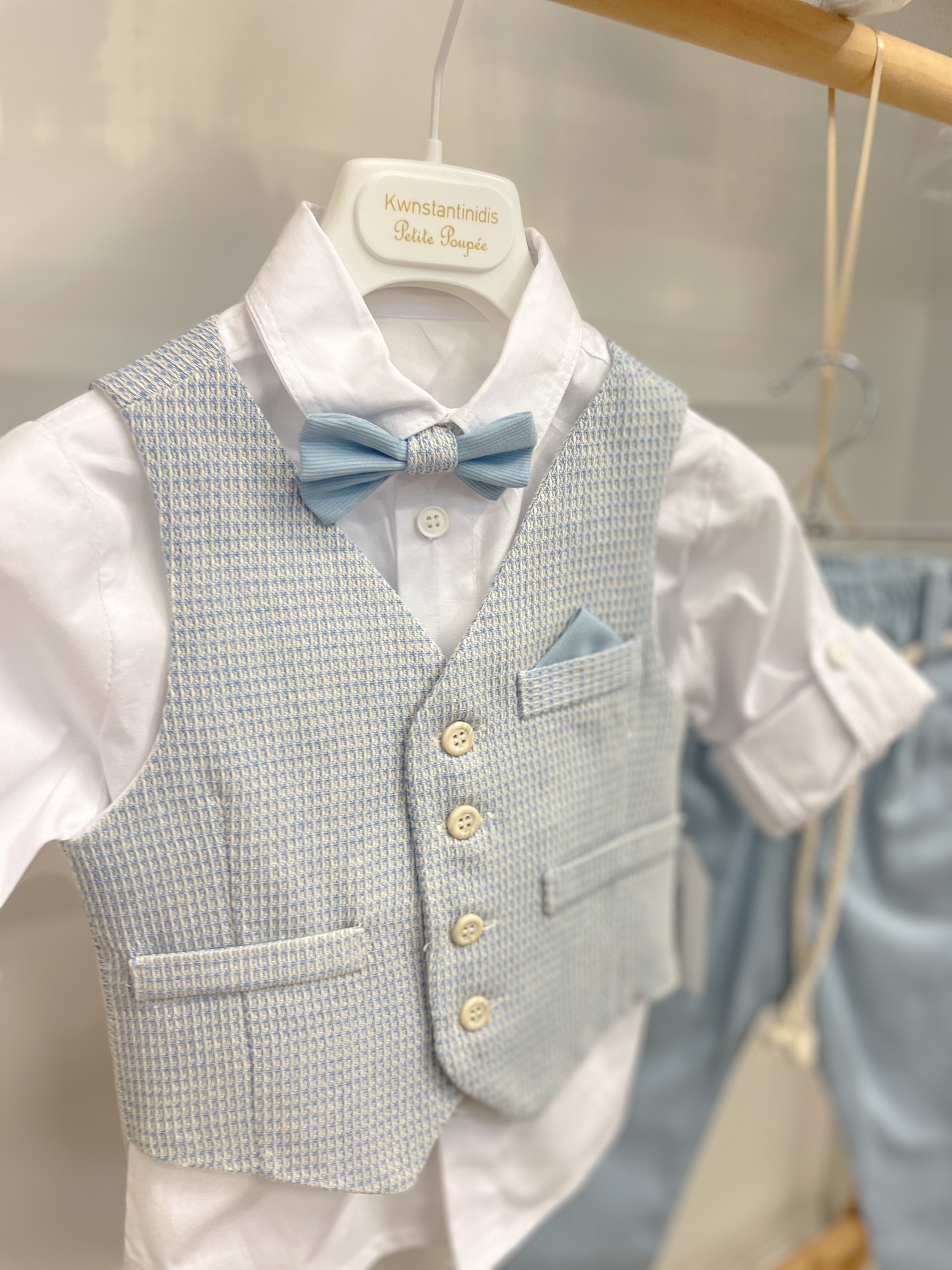 Κουστουμάκι βάπτισης σε σιέλ αποχρώσεις με απαλό μπεζ, βαμβακερά πανιά σε όλο το σετ, το γιλέκο είναι σαν πλεκτό σε σιέλ και μπεζ χρώμα, για ζωνάκι έχει το σχοινάκι, μπορεί να μπει τιράντα αν το θέλετε.
