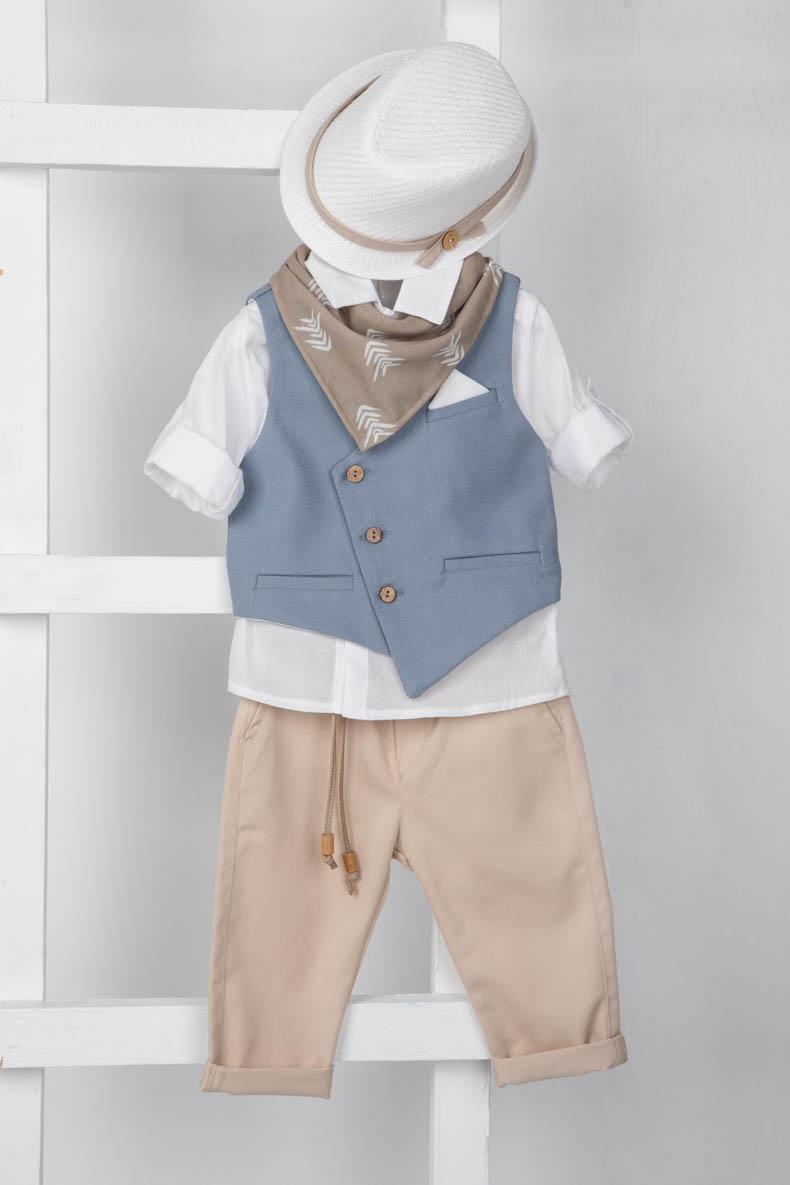 Για τους λάτρεις του κλασικού ο Leandros είναι μία εξαιρετική επιλογή. Αποτελείται από κρεμ καπαρντίνα παντελόνι, λευκό βαμβακερό πουκάμισο και στραβό ραφ γιλέκο διακοσμημένο με ξύλινα κουμπιά. Αξεσουάρ είναι το μπεζ κορδόνι για ζώνη, το λευκό καβούρι και το σκούρο μπεζ φουλάρι με σχέδιο.